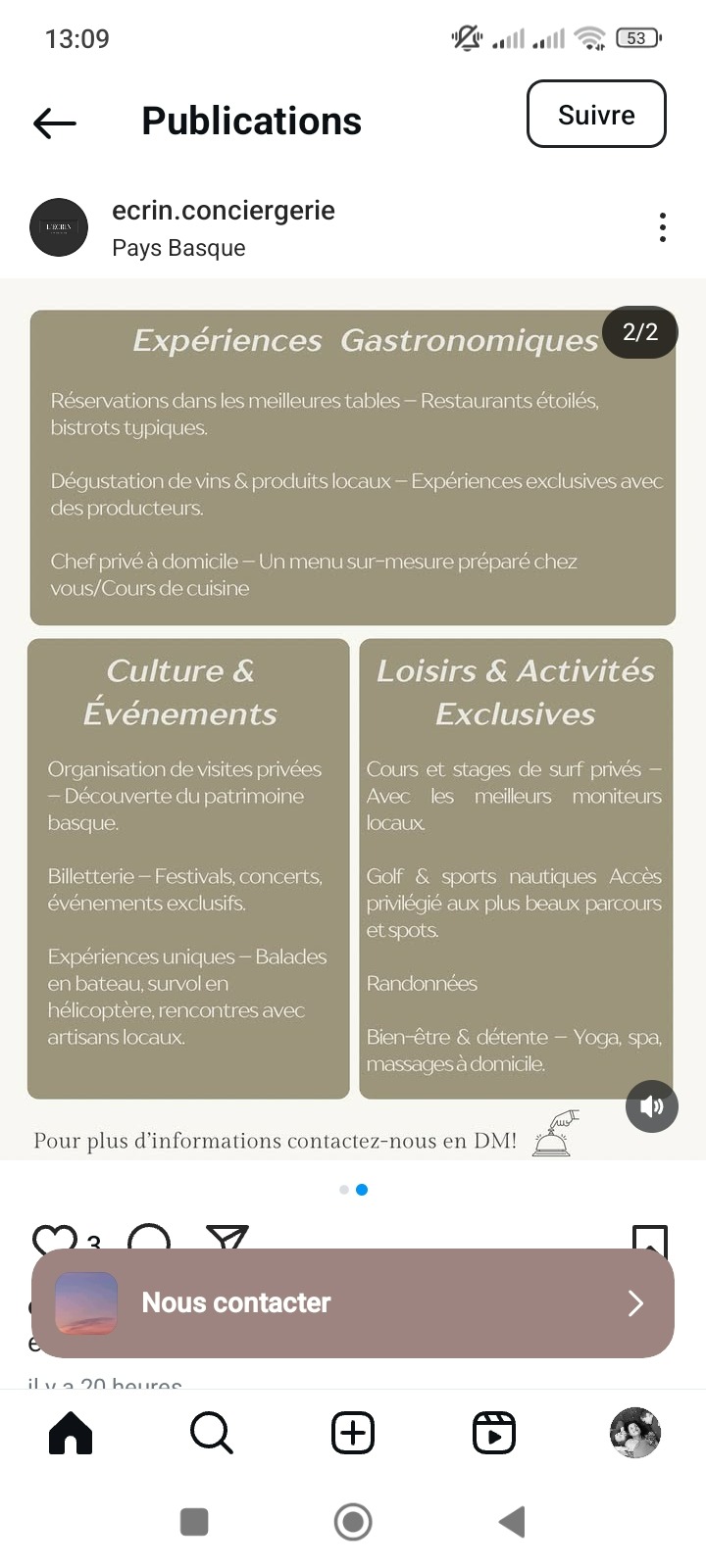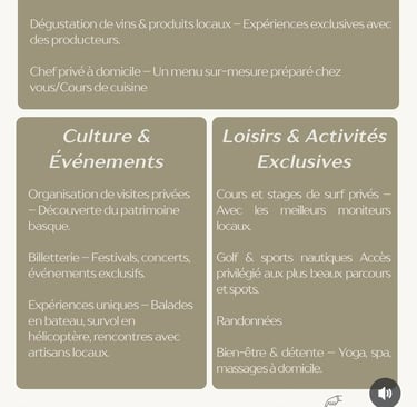 Spécialisée dans l'accompagnement des voyageurs, notre conciergerie propose des séjours personnalisés alliant confort, authenticité et bien-être. De la réservation d'activités locales à l'organisation de services exclusifs, nous créons des expériences uniques pour que chaque séjour soit mémorable.